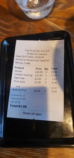 Read moreGiven one star because I can’t give none. That’s definitely is not a Brazilian Restaurant. The customer service was terrible and rude from the beginning until the end! Some of the food you can say is similar to Brazilian food. Feijoada with curry? Never ever see that. The guys running the meat didn’t even have the sense and patience to ask and wait for us to decide if we wanted it!! Everyone looked like they wanted us to eat quick and go home!! We didn’t even finish eating properly and they start collect the plates without even ask if we finished! Which kind of customer service is this? We are paying for bad service and bad food? We went down from Manchester to try this restaurant but definitely I will share my experience with all the people I know so they don’t waste their time going there. I think before you use a Brazilian name in a restaurant you need learn a little bit more about the food and people! It’s ridiculous for you to leave your house thinking you will be in a place to remember your country and get yourself in a place where no one speak your language, the food and meat is completely opposite and the customer service offered from all staffs included the manager is terrible! At the end we ask for the bill and the guy come throw it on the table and keep walking behind us with the card machine on his hand! Come on! We need check the bill right ? He then took the bill with him and Then when he returned to the table and we requested the receipt he was on the phone and giving us dirty look and just threw the paper on the table! Very unprofessional and disgusting behaviour !