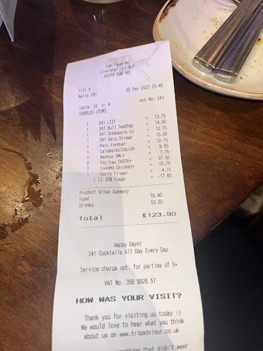 Read moreAVOID the so called bottomless brunch, it's appalling!!! £35 for the plate of food pictured and 5 watered down cocktails. That's what constitutes a 2 hour bottomless brunch at this 'restaurant', which is pretty appalling. It was such a disappointment for my daughters 18 birthday meal and an all round bizarre experience. Our party of 12 only had 4 drinks each, served during the actual 2 hour bottomless brunch, and the 5th drink came 30 mins after we'd ordered it (we ordered it 20 mins before the 2 hours ended), as it just sat on the bar, waiting to be served...there's lots of waiting at this restaurant. Cocktails were very watery (tasted of fruit juice and soda water) and our itemised bill was doctored. The 4 glasses + a bottle + 4 glasses of proseco = 14 glasses, are down as 78 glasses on the bill, which is very odd, and we left sober as we'd been clearly been served mocktails for 2 hours. People moved onto Corona and prosecco because the cocktails are so bad here. We went, as a pre booked group of 12 people for a bottomless brunch £35 pound per head. The food you get is a low end starter type dish and we sat for long periods with bottomless, empty glasses, trying to get another drink. With 20 mins of our two hours left we ordered one last drink, which took 30 minutes to arrive and we only got that because I refused to pay the bill until we got that drink each. They then took my bill away and added a 40 pound service charge. I always pay 10% tip, so they’d have got that anyway. Poor effort, and place I’d avoid. Possibly the most disappointing £420 bill plus £40 service charge I’ve ever paid. We've emailed the restaurant to complain and have so far been completely ignored, which sums up our terrible Las...