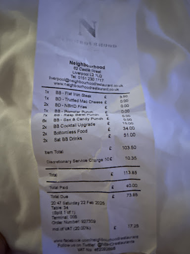 To celebrate my wife's birthday we thought we would go up market a little from our usual restaurant choices. .. Big mistake, waste of money. Arrived 18.55 for a table pre booked at 19.00. We were told the table wasn't ready , no problem these things happen. We went to the Bar to get a drink.. we waited to be served.. We waited, we waited ,we waited. About 15/20 mins past 7 our table came available .. We still hadn't got our drinks so asked could our drinks be brought over to the table... Fast forward to about half past 7 maybe 25 to 8 ...drinks were sitting on the bar.. I asked the staff member shall I get them..as we had been there probably 35 mins and stull not started our night out... As my Mrs was drinking cocktail by the time it arrived it was basically a 10 pound glass of water...