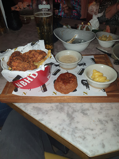 3 small bits of fried chicken, served with McDonald's frozen fries. Served on a wooden block.. in a paper k.f.c bucket ... yes you get a double hit.. Beyond tacky in a top end restaurant..