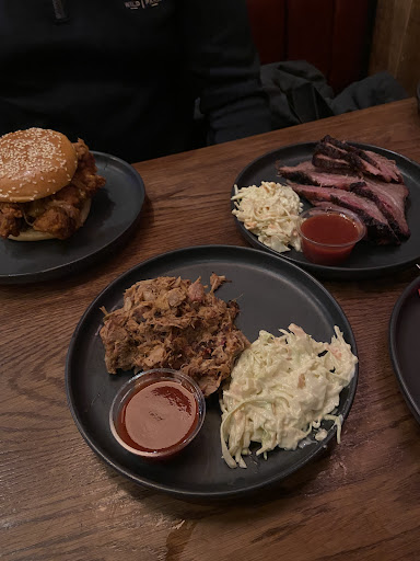 We ordered the Kentucky Platter for 3 which was £95.70 and not worth it. For that price, each individual gets: a burger or sandwich of their choice, 1 pork rib, 1/3 of a beef rib, 1 slice of brisket, 1 sausage each. The platter also came with 1 garlic mayo dip for 3 people, 2 round pickles slices, a small mac and cheese bowl, and one sad tablespoon of coleslaw all BETWEEN 3 people. The burger i selected was rather bland, the brisket was just okay over half of the single slice I had was pure fat, the pork rib was good and well seasoned, the beef short rib was tiny: as we only got one split between 3 people we had a singular bite each but the bite i had was nice, the sausage was great but disappointingly the best part the menu where we all looked forward to the slow cooked meats.