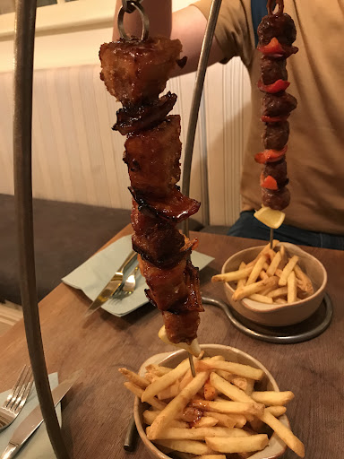 When a waitress brought over the hanging kebabs she spilled a small amount of the garlic oil on my dress as well as the girls dress who was sat next to me.