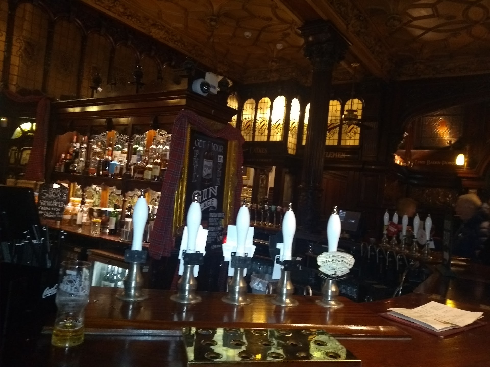 We had a night planned at the Philharmonic Hall and wanted to grab some food before we went, I had been the Philharmonic Rooms before, but only for a quick drink and was really impressed by the grandeur of it all. Having researched the menu before hand it all sounded tasty, so we chanced it on a Friday at 4pm. The place was rammed, customers looking round like headless chickens trying to get some direction from the staff, I approached the bar and asked did we need to book for food, the man struggled to grasp what I was saying, eventually he said 'no no walk in till 5pm, can sit over the, just not in the grand dining room as its closed'. Well 'over there' was to little side rooms with about 6 two seater tables in each, both packed. We spotted a table with no chairs and jumped on it before anyone else could get it, we hunted out 2 chairs and we were at least sat down anyway. You'd think the staff would be used to this level of business and offer more direction to customers, not everyone is a regular patron. Ready to order we went the bar, when I said I wanted to order food another staff member said 'ill need to check if that's ok', puzzled I waited and when he came back he said 'sorry we only do walk-ins till 4pm' stunned in amazement, after battling to get a table and already been told it was ok till 5pm, I asked him to check again, he came back and apologised at his mistake. As I was new to the pub app I got a free cider voucher (Yay, highlight of the visit!) We were squashed against a doorway, with people constantly going in and out, unsurprisingly it took a while to get our food, but when it did arrive it was hot and tasty, but the prices are premium for the portion size and quality so could only give 4* for food. We didn't have much of a chance to look around because there was just so many people, it was also incredibly hot in them side rooms, was melting.