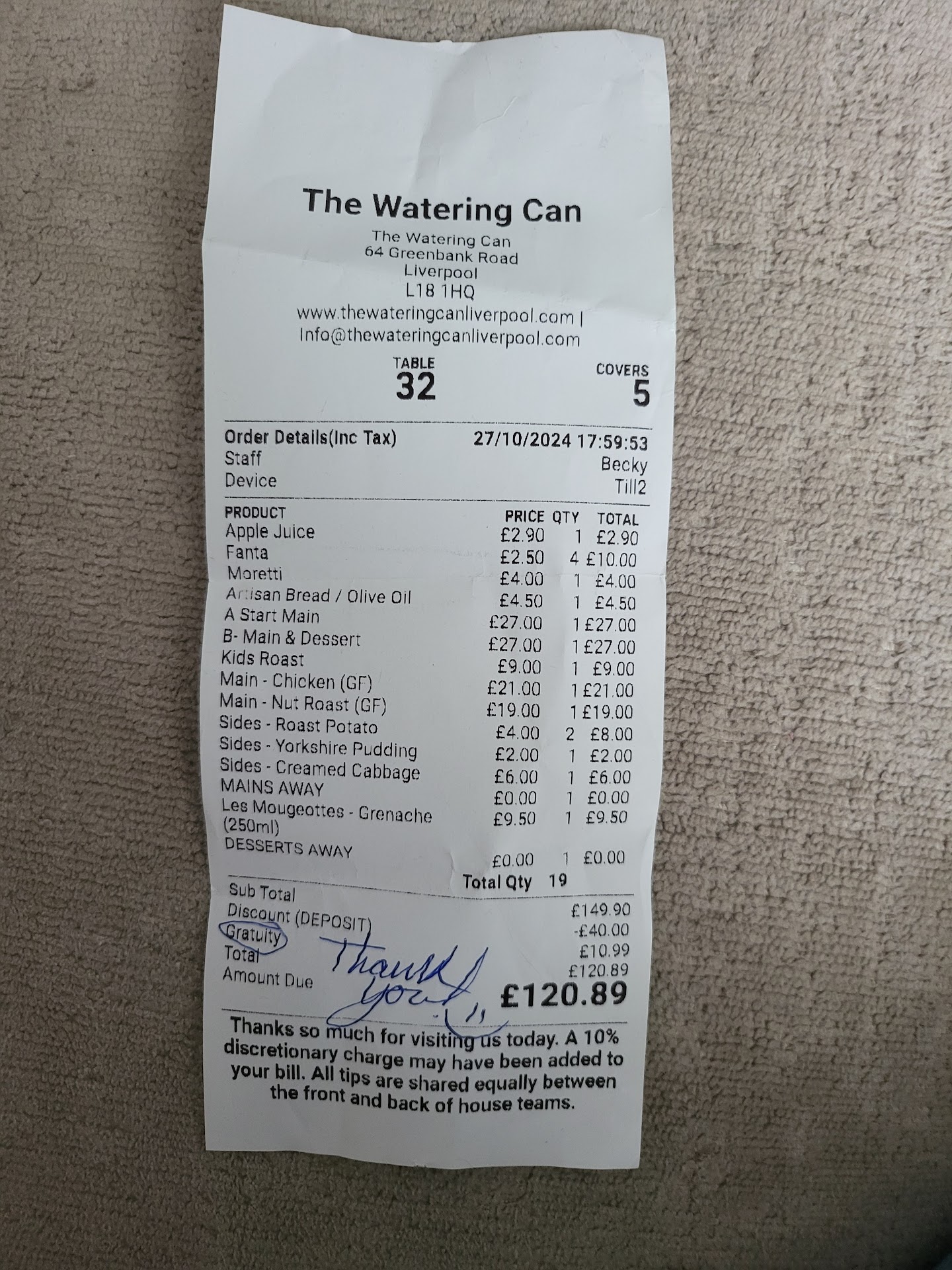 Unfortunately we are leaving a one star review and it's only because of the atmosphere of the venue that it's getting the one star (and there is no option to leave zero stars) We attended as a four adult family last night 27/10/24 along with my grandson who is 10 months old. It was our first visit to the venue and we were excited to sample for ourselves what people was raving about on Tiktok. We had booked a table for 4.30pm and upon our arrival we were told that certain items of the menu weren't available The black pudding starter, The pork option on the roasts and also no cauliflower cheese. When my wife expressed a bit of disappointment to the server she was spoken to by the server and told "Well, we are open from 1pm and you have booked a table at 4.30 so things run out" We discussed as a family about leaving and going somewhere else but chose to give it a go as we were already there. Surely as a venue who advertise all over social media about the roast dinners you serve you should ensure you have enough stock to cover your bookings for the evening. I put my grandson into the high chair supplied and then spent the rest of the evening having to slide him back into it as he was able to slide completely off the front of the chair. These chairs are not safe for young children to use due to the ill fitting safety strap. We ordered the dipping bread option to eat whilst we waited for our food. This arrived quickly i grant you but with only four half slices of bread for a cost of £4.50 this is a rip off. The starter of King prawns then arrived and was found to be luke warm which is not ideal to be serving shellfish. This is where our doubts started. I then moved my empty plate to an empty table away from reach of my grandson. A server then arrived to take the plate and said I take it your finished with the plate and I found her to be very rude. Our main meals then arrived two of which were a chicken roast option, which we found to be on the bone, which wasn't stated on the menu. If it had been, we would not have ordered it. I myself ordered the beef option, my wife the nut option. We ordered extra roast potatoes and creamed cabbage. We also ordered my grandson a child's option roast dinner.(£9.00) The food that arrived was again not hot on any of the meals. The creamed cabbage was still raw, the roast potatoes were definitely not roasted more like deep fried and we had to use the meat knives to cut through them as they were rock solid. There was no way we could feed any of my grandsons meal to him as everything was hard to cut through let alone feed to a ten month old child.(£9.00) My daughter in law had to scoop the inside of the deep fried potatoes out to give something to our grandson to eat. The Yorkshire puddings had absolutely zero taste to them and were very greasy at the bottom. We ordered an extra Yorkshire pudding (£2.00) for my daughter which she couldn't eat due to it being tasteless. We left that much food on the plate that the server asked us if we wanted a takeaway box to take the remaining food home with us. So for this privilege we were charged £149.90 yes it included the "Gratuity of 10.99" i did not want to cause a scene as I was with my family but there is no way I would have paid a gratuity charge as the service was awful along with the cost of the food which was £123.50 (we had bought a couple of drinks which if added would make the bill up to £149.90) The videos on social media are very misleading and the quality of food is whoafully below what is to be expected. I would definitely not return to this venue in the future. For the prices they charge you can have a decent quality meal at other premises where food will be cooked correctly and arrive at your table hot. Definitely one to avoid. It's a shame I didn't check the recent reviews as I would not have booked...