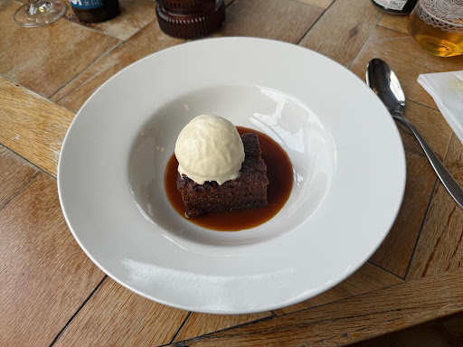 A lot of choice on the menu, which is seasonal – went for the chicken liver parfait (beautiful chutney, crunchy bread and smooth, smooth, pate 😊), followed by the schnitzel (caution – this contains a bone – but wow, that topper was superb – such delicate spice). Side of the truffle chips to accompany the main – these were seriously chunky, more like roast potatoes in stature than the chips of olde. Crunchy and fluffy inside. Superb first two courses – a lot of effort has gone into these. Dessert was the sticky toffee pud, of course. Alas, no custard option (the world has forsaken custard, it seems), but there was a rich sauce and ice cream. The menu is a fixed price – two courses for £43 or three for £49 – good value for high quality food.