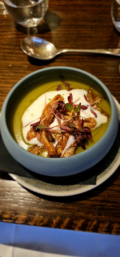 We had the 3 course set meal for £33 which for a central London restaurant is bloody good. 3 choices per course including a vegan option. Starters - Carbonara for her and leak and potato soup for me - were very filling and both slightly over salted.