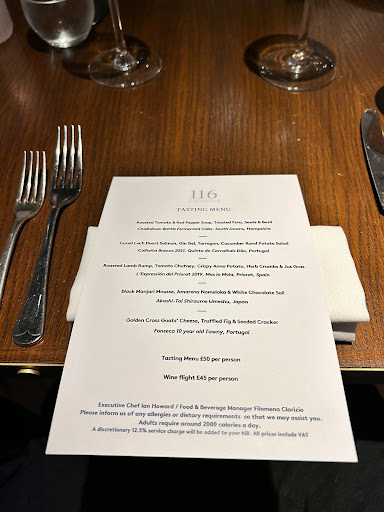 We were gifted a 3 course meal as a gift for a Christmas present, and we waited until August to use the voucher as it has been the first time we have been able to do so. When we got to the restaurant, we were greeted by a lady called Claire who showed us to our table and took our coats. She took the time to chat with us and make us feel comfortable in our surroundings. Asked if we wanted our complimentary glass of bubbles , where she allowed me to change mine to a glass of lager. She also asked if we wanted water, be it tap or bottled. We then met Johnny our waiter, who was from Romania, but had spent some time living in Prague, so my partner had a great chat with him as she also previously lived in Prague for 10 years. We then looked through the set menu that was included in the voucher, but could have chosen anything from the a la carte menu at an additional charge. The set menu choice of starters were as follows... Tomatoes, cottage cheese and olives. Whippded cod roe Chicken and vegetable broth. The main course choices were as follows... A mushroom pasta dish Pork belly with mash and vegetables Sea bream. Dessert choices were as follows... Dark chocolate mousse c/w coffee icecream Strawberry cheesecake Cheese of the day with grapes, etc. We gave our choices to Johnny and enjoyed each others company whilst we waited for our starters that arrived in a reasonable time. For starters, my partner chose the cod roe and I had the broth. Both were enjoyable and quantiful without being too little or too much. We were then introduced to Barry who asked if we wanted any wine with dinner. We started chatting and found that he had been to Moravia to visit a vineyard, and therefore we reminisced about our visit to the same vineyard a few years ago too. Again, we felt that he wasnt rushed, and took the time to chat with us. We asked for his wine recommendation for dinner, and we agreed on a Chardonnay that was chilled to perfection, giving that nice crisp, slight oak taste on the tongue that complimented both main courses to perfection. Not the cheapest, but would you really expect anything different from a Michelin starred restaurant in central London For mains, my partner had the pasta and I had the pork. Again, both dishes were perfect, and there was plenty of the pasta dish to the point my partner did not eat it all. For dessert, my partner had the mousse and I chose the cheese. Again, both were great, the mousse beautifully presented in a dark chocolate parcel that cracked delightfully with a little pressure from a fork. My cheese, along with grapes, celery and cheese biscuits, were just great, especially as I chose to accompany this with a glass of port.
