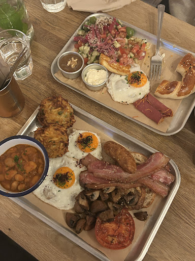 🫶Definitely gonna recommend! Recently, I found a Middle Eastern brunch in Hackney. I am tired of eating the same Full English Breakfast which costs £10.5 and £12 at every turn. Today, I want to change my taste with my friend from the same city. A friend who lives in North London said that this shop is delicious in its blind spots, and we started by following doctor's orders (no. My friend ordered the main Hackney feast, and I ordered the marharba. 🥓 Hackney Feast: A Pro Version of the classic English breakfast This dish is full of meat! Organic cumberland sausage served with greasy orange juice. Bite into it while it's hot! The roasted tomatoes and mushrooms were tender and juicy. The sweetness of the tomato and the saltiness of the bacon intertwine in a rich layer of flavor that completely breaks the monotony of the traditional English breakfast. Fresh sourdough bread topped with long-simmered traditional chickpeas gives you a boost to get through the day. 🐑 Marhaba: A tingle of Middle Eastern flavor If you also like to try different flavors, Marhaba is a must! Delicious! 🥹 I originally ordered this dish for two pieces of grilled cheese 🧀, but it turned out that the bread was also delicious. Although it felt a little hard at first, the Greek yogurt was really wonderful after dipping. They gave away two kinds of dippers. When you're tired of big chunks of red meat, it's nice to scoop up a refreshing Middle Eastern salad with a spoon 😋it's soooo Good.