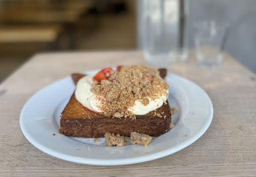 If you prefer savoury options, try the fried eggs in chili butter with spiced almond and onion crumb, sweet red peppers, labneh, and herbs on sourdough. Other options include cheesy leeks on sourdough, a tuna melt that sold out quickly, and a hot honey pepper toastie.