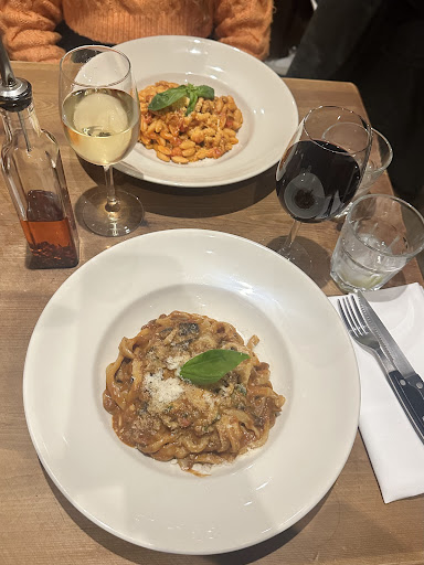 The interior of the restaurant is cozy and rustic, with warm lighting and traditional Italian decor. There is both indoor and outdoor seating available, and the outdoor seating area is a popular spot during the warmer months.