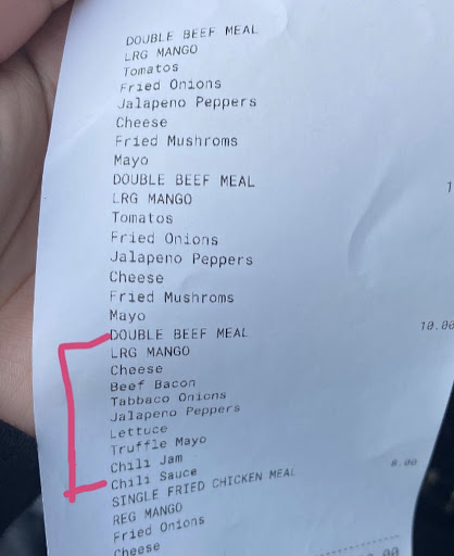 Also ordered a chicken Burger and loaded fries. Looking at the receipt after ordering - found we were getting grilled chicken instead of the fried chicken. When my wife questioned him about the burger she was told they dont have the fried chicken any more. Had we been informed prior to placing the order we would not have ordered the chicken Burger. We didnt receive the loaded chips but we did not get charged for that either (Thank God for that).