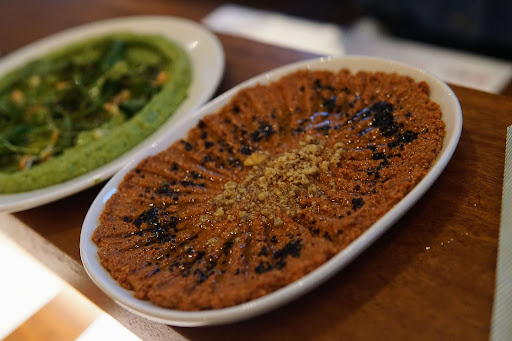 The decor and atmosphere is buzzing, taking you back to the street markets of the Middle-East. The main dining area is taken by a long communal table, but there are individual tables for more intimate experiences as well as a dining counter in front of the open kitchen.