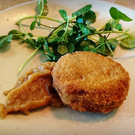 I had the pigs tail to start with which came in a crispy coating with apple mustard and was pleasantly surprised with the tasty dish. I was actually expecting to see curly tails on the plate! Spaghetti for mains was a bit disappointing. It came a bit too al dente for me, but staff were eager to please and replaced it as quickly as they could. The replacement was only slightly better. I rarely eat pasta out so I'm no expert and rather than make a fuss and have my friends wait again, I accepted it. Dessert however, made up for the mains. The polenta cake with crumble was better than expected and was complimented by the cheese cream which accompanied it.