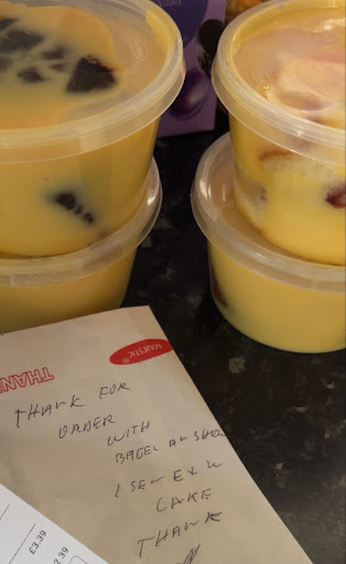 The baguette itself was cold/flat with no crunch. Just felt like a chore eating through it. The chicken was fairly nice mainly due to the crunchy exterior. Combined with the sauces and toppings it tasted good enough to stop my late night hunger. The chocolate cake was is simply a store bought cake cut into pieces and put in custard Simple. Hits the craving if need be. Total cost me £10.