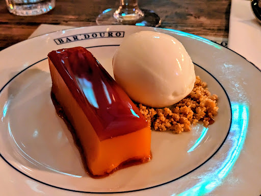 The grand finale of my meal was the Abade de priscos, a dessert that truly stood out. This rich egg yolk pudding, exhibiting robust flavors and a subtle sweetness, was expertly prepared and complemented by a high-quality lemon sorbet and a delectable crumble. It was a delightful symphony of tastes and textures, making it an excellent choice to conclude the dining experience.