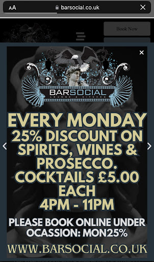 I made a last minute booking just to have a quick drink with a friend, would've walked in however their website advertised a deal which seemed was only applicable if booked quoting a specific message (shown in photos). Booked for 10:15, will admit that we arrived 15-20 mins late. It was a Monday night, there was no security, we walked in and only 2 customers were inside, so we went to the bar which was clear and I attempted to explain to the barman that I made a booking and was going to show him my confirmation but he cut me off and was saying āyeah yeah thatās fine, cocktails are Ā£6.95 tonight Iām doing a special dealā, I tried to explain again that I had booked using a quote which stated I will get Ā£5 cocktails until 11pm (as I said, I only wanted to pop in for one drink). When I showed him the advertisement on the website, he became very rude and dismissive, started telling us āIām doing a good deal tonight, you canāt get drinks cheaper anywhere elseā, āif you came earlier I wouldāve done it but itās too late nowā (I donāt believe he wouldāve given us the deal that I booked, even if I did get there at 10:15), āitās a quiet night tonight, normally I would close up at 10 oāclockā (even though their website states they close at 12:30am on Mondays and Iād expect that Monday nights are usually quiet), āIāll give you drinks for Ā£6.95 all night, itās a good priceā (wouldāve been decent if I planned to spend the rest of the night there and have multiple drinks but that was not the plan) then he went on to say sternly when my friend asked why we canāt have the deal that was promoted on the site (which is what captured us in the first place) ālook Iām not doing it. Iām not going to do the drinks for Ā£5. Iām not doing it. Ā£6.95 is the best deal you can get around here at this time. Have a seat, there are loads of cocktails to choose fromā and then added āthat deal shouldnāt even be on the site, Iām not sure why it is up thereā (as if Iām to blame for that??? p.s. the deal is STILL on the website)⦠I don't know if the barman is the owner but there didnāt seem to be any other staff present and I was put off by his attitude and he made me feel quite uncomfortable, so we decided to leave. No one deserves to be spoken to in the way that the barman spoke to us, we were not rude/disrespectful at all, it was completely uncalled for. Getting snappy and loud towards potential customers for simply enquiring about why they arenāt able to receive something they booked, that was advertised to them via your website is out of order and poor customer service and bad manners. We ended up discovering a bar less than a minute walk away which had a much nicer atmosphere, friendly bar staff and was actually quite filled with customers. The bar lady gave us a lovely Ā£6 rum punch deal and because of the comfy setting and kind service, we ordered another round. So gladly, the night wasnāt ruined because of our Bar Social experience. Would definitely recommend checking out āFour Thievesā -nice drinks, happy staff and also arcade and games room.