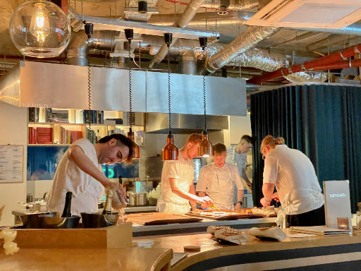 Andy Beynon's restaurant is a wonderful space that reflects his passion and drive. There is an 18-cover copper horseshoe counter encircling the kitchen with a couple of rectangular tables almost in the kitchen space itself, all with fantastic views of the meal as it is being prepared. The ceiling is warehouse bare and the music reflects Beynon's personal tastes and is balanced to the course being offered. Beynon is an accomplished chef and a charming host. The chef and his brigade are part of the service at Behind, talking to diners about each dish as it is presented to them.