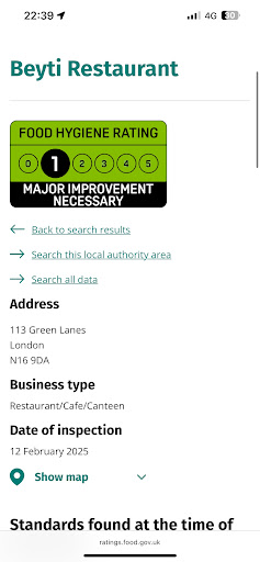 Turns out the restaurant has a Food Hygiene Rating of 1 (from February 2025). That rating absolutely should be visible to the public, and the fact that it wasn’t—and that staff refused to acknowledge it when asked—feels deceptive and unsafe.