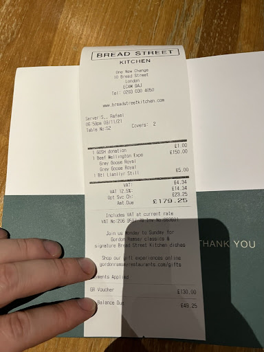 The biggest surprise was when we received the bill. We only ordered a bottle of still water (£5) as an extra to the experience, but the bill was £49.25 of extra on top of the voucher. I checked the bill and it said that the experience itself was £150 and then they deducted £130 for the voucher. Even though, their menu said £65 per person, so I have no idea where they got those £150. I asked the waiter and then he asked me for pointing it out and said that he'll change it, but trying to explain as it is supposed to be like that.