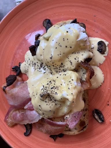 Meanwhile, my wife, seeking her own epicurean adventure, opted for the carbonara eggs Benedict. And what a delightful choice it was! The carbonara sauce danced upon her taste buds, while the eggs, in their bright orange glory, brought a sunny disposition to the dish. It was a true triumph of flavors, a tale of taste that left her enchanted.