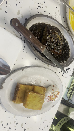 Now, onto the foodāthe dishes were packed with flavor! The halloumi was an absolute standout, perfectly cooked and beautifully seasoned. While Iām not usually a fan of mushrooms, the oyster mushrooms were done well, though they were slightly burnt, which impacted the flavor. At Ā£9 per skewer, I normally would have addressed this, but we were short on time. The hummus was wonderfully creamy and rich, and the latkes were crispy and flavorful. Everything was beautifully presented, and you could tell a lot of thought went into the flavors and textures.