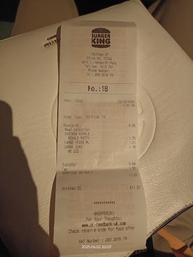 Read moreWould give zero stars if I could. Absolutely appalling service at the Feltham branch. Ordered two large adult meals and two separate burgers for the children, with a view to sharing fries, only to be told that it is BK policy not to serve burgers on their own, only as a meal...despite separate burgers being advertised on the menu. We pointed this out, only to be told that the duty manager (Nagesh) would send a pic of the menu to the manager and get it changed. This isn't what we wanted. All we wanted was two separate burgers for two small children, not to be forcibly sold 4 meals with fries upon fries, which will just get wasted. We were dealt with absolutely no understanding, compassion or empathy by the staff in this restaurant, and we're so disgusted with our experience that we decided to leave empty handed as it was obvious there was going to be no autonomy on the part of the duty manager to accommodate our request. We now have two extremely upset children on our hands, who were greatly looking forward to this treat and are now having to go without. On Christmas Eve of all days...the one time children should be looking forwards to a happy time. So thank you, Burger King Feltham for ruining Christmas before its even started! You are a disgrace and should be thoroughly ashamed...
