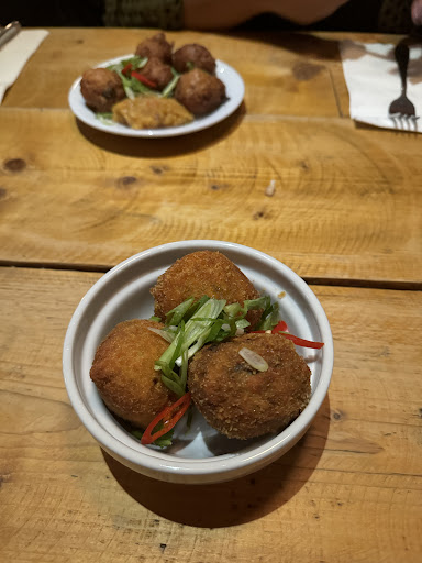 The crispy squid was the highlight of my whole meal, I did not travel down to Deptford for SQUID! The oxtail croquettes were nice. The fritters were more batter than saltfish. The sauce that it comes with was tasty, it saved the dishes. I had that sauce and the plantain with everything, it "complimented" and saved the starters.