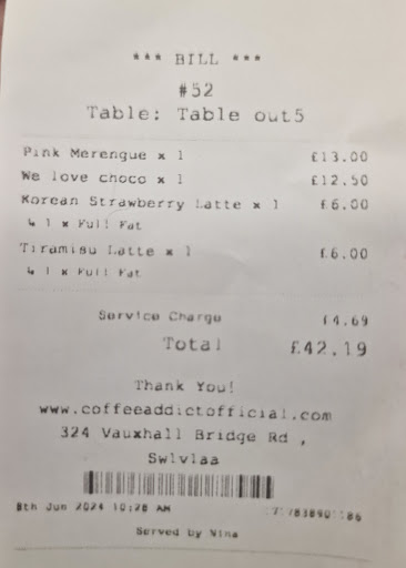 Total price was 20.76 (-.50 was deleted as she deduce the strawberry add on to the menu price for me) Ice latte 4.4 (from the bill but the menu is 3.8) Cream Brûlée pancake 11.5 (menu price I rmb, but I didn’t look at it on receipt)