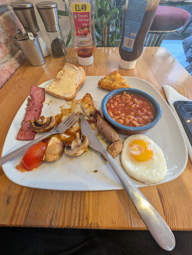 First off - a half hour wait for a full English is a bit mad but I'll let them off given that the staff were genuinely very friendly. If I'd been in a rush it would have been hard to swallow. However, ÂŁ12.5 is an expensive greasy spoon breakfast. And with that in mind, the food was genuinely terrible. The sausage (singular) was anemic and tasted like soap (worse than wetherspoons), the "bacon" was not real bacon - something processed that tasted like spam, the food is served with one piece of Warburton's white bread (straight from the supermarket across the road I suspect), the tomato was not cooked, and in general the portions were poor. Lastly you're squeezed in like a sardine for the privilege. Disappointed and do...