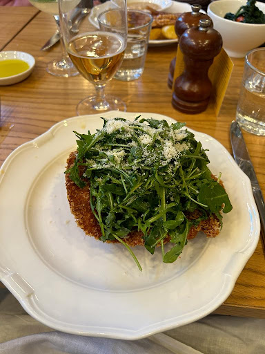 Mains: Linguini with Crab, Lemon & Almond Pangrattato â Strong crab flavour, which I liked. There were some crispy flakes on top (likely the almond Pangrattato), but I couldn't quite tell what the flakes were. Were I'd like to find out. The texture added a good contrast, though. Chicken Milanese with Crushed New Potatoes â Out of the three places Iâve tried chicken Milanese in London, this one is the best so far. The chicken was juicy inside, perfectly crispy on the outsideânot too much, not too little, just right.