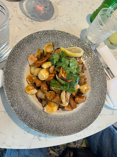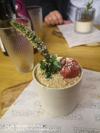 Read moreArrived for Father's Day dinner mid afternoon at this recently opened Portuguese restaurant.. We were advised that as it was a busy day, we had a maximum sitting of 2 hours. Having been advised, we weren't too surprised that we had a small wait until our table was ready. We could sit at the bar and decide what we wanted from the menu. It also gave us a chance to see the huge collection of gins on offer, including Big Boss from Portugal. From our seat we could see the open kitchen and the hard work that goes on therein. They had no problem letting us know if any of the dishes were not suitable for my son who has dairy and nut allergies. In the end everything we chose was suitable for him. In all, we tried the octopus, pork, clams, mussels. They were all tender and fleshy and of extremely good quality complemented by the traditional flavours of the Portugal. Punched potatoes are something I have never seen before, and I'm sure I will see this catch on as a future trend. It's a whole pierced into the potato with a sprig of rosemary poked inside and then baked allowing the flavour to permeate throughout. Desert was more of a problem for my son with a dairy allergy, but he was happy with the lemon sorbet served in a frozen lemon. My coconut and mango desert was a little hard to explain, but I'll give it a go. It's a little like a creme caramel in that it's set, but the white firm base is a set coconut cream with a more lighter mango top. Lovely and light. My daughter had the chocolate cake which I expected to be stodgy as most are, but it was remarkably light while being moist. Delicious. The team at Capricho all worked well together and being both friendly and efficient despite it being so hectic. We thoroughly enjoyed every element of our visit and will...