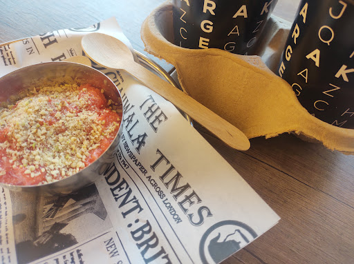 Service was a bit slow and took around 10mins to get the food. This arrives in polished metallic āthaliā with a newspaper cutting( reminiscent of how indian street food is served in India). You get 2 rotis, a folded omelette and a small bowl of reheated dhal.