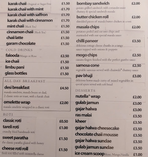 Ā Ā Ā Read moreWhen Google asked me to review, I almost didn't because the only good thing about the food here (for our lunch group) was the cold coffee. Having starved myself for lunch at Chaiiwala, I was all set to have a great meal. We ordered the mogo, masala fries and chilly paneer to share with great hopes. The mogo was average with no spicing, the masala fries were dipped in ketchup (ostensibly the masala sauce, NOT) with a smattering of cheese ( for which I paid 50p extra) and the paneer was dry, chewy and smothered in run of mill barbeque sauce. Even between 5 people, we couldn't finish the paneer as it was so tasteless. We moved on to a more substantial meal including pav bhaji, veg roll and chicken Tikka sandwich (only because it was too late to go somewhere and maybe we were still hopeful!) The food was bland, the veg roll tasted like it had come a supermarket shelf with days old mint chutney. The bhaji in the pav bhaji was just about edible.