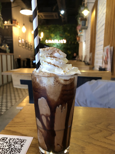 Charlie's looks a lovely spot, and is in a great location to get lots of walking traffic customers. It's right next to Primark in Wood Green and has inviting decor and an extensive menu for breakfast and lunch. The coffee was standard and quite good, served in cute mugs to the table. I also ordered the "Eggs & Bacon" waffle set. For the waffle set I found the presentation to be professional: there were pesto drips in a circle around the double stacked waffles with bacon, and a single fried egg on the very top in the centre. However I found the waffle to be severely oversweet and dry. crumbs that I would pick up with the back of my fork would either crumble or crunch in my mouth as mostly sugar. Even for a sweet waffle set I feel this would be too much. The bacon as well was very dry, leading to a difficult pair. The egg though, lovely. Loved the egg, and the small amount of pesto. The atmosphere feels more cluttered than it perhaps should. The angle of chairs for the main row is in the restaurant style with the table edge against the wall and chairs on either end. To fill the space it makes customers bump into each other often. In the back as well there are single seats and a 'hidden' door leading to restrooms through the greenery wall, but there must be a draft because the door doesnt latch and instead breathes constantly, which made me think I would have to scoot for someone at least a dozen times in error. Overall I'd come back if all I wanted was a coffee, but will try other spots for...