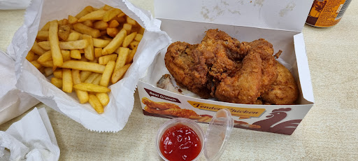 They've got two choices of chicken, normal and spicy. The spicy one, chicken tastes alright little dry and hard. If you come at the right time, you can get really fresh ones little oily but it will do the job. Normal chicken, I tried the burger and the burger had air with in the skin and chicken... Wings, seem to be ok, it has flavour and slight hint of paprika. They do BBQ lamb ribs too, the sauce they use taste really good but the lamb rib seem to have more fat then meat Chips, cheap quality potatoes or something .. big let down on the chips
