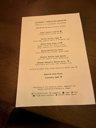 Read moreMy father and I visited Cinnamon Bazar last week whilst we were in London. My dad had pre-booked via OpenTable for the menu as part of the London Restaurant Festival 2025. The staff were very friendly and attention throughout the evening and we were even given an unprompted complimentary round of drinks due to a delay in receiving our main course.