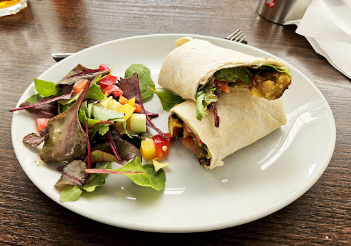 Situated in a locally popular independent garden centre, it's not the place for a quiet candle-lit supper (although their extensive menu could easily handle that, were it a proposition). So based on a simple lunch of a falafel wrap served with a simple salad (or chips, see picture...) I take my hat off to them for the quality of the food that they serve. Served with simple good service, immaculately clean cutlery and bursting with flavour, this has to be eaten to be believed. Well done, and thank you!