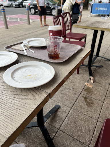 Costa shameless! Very dirty place! No pride in the job, no care of the place given in the costady... Hazard to clients!! After I spoke with one on the staff, rubbish was moved from one corner of the counter to another.... I am not sure if the training provided by the company is not adequate or lacks managerial skills or just lacks common sense... I was so disappointed with the place!!! There is so much competition in the area, and I love Costa coffee, but 4 people on the shift ( I saw them: walking, serving ,replacing stock,even offering to carry trays to the tables) could in 5 min get stuck high tays out of the tables ... No notice of self-cleaning - asking customers to put trays on the ruck after finishing having drinks .... if inspector ever arrives to this establishment ... bey...