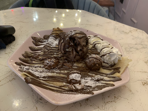 I ordered the Kinder Bueno White pancakes and they were genuinely delicious The pancakes were soft and fluffy with a fresh homemade feel They came with whipped cream and a very small scoop of ice cream and when I say small I mean a tiny teaspoon sized scoop I was a bit surprised by how little ice cream there was but to be fair I was not disappointed because the prices are actually quite reasonable and the dessert was still packed with flavour The white chocolate drizzle and Kinder bits added the perfect touch of sweetness and everything worked well together