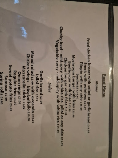 Food- my gosh it was the worse service we ever got from a restaurant. We didn't even get starters as we knew it will take forever to reach us, we just went straight to the mains and order. Some of us wanted tilapia fish, which they run out which is typical as they opened at 5pm, so we decided to get the seabass fish we thought was again tasty and was whole fish for the price. When it came out it was 2 slice fillet disgusting as if they just put in the frying pan and straight to the plate. No season (salt or pepper), i then said to the waitress, it bad for an African restaurant to serve such a bland food like this. It was also meant to be served with other items and some garnish, but the waitress does not have a clue as she was arguing and getting fedup. We had to say to her is our money and we except what is written down should be part of the dish. The food was cold by the time it got to us, so did not eat much, after few bites as i was hungry, i started to feel upset as my stomach was very painful with cramps and went to the toilet to vomit. I think i had food poisoning then. It was a large group so some had their food abit early as for the rest of us well we waited and waited and waited. I don't think i will eat from here again after my experience, but will come back for drinks and dancers. Please get rid off your cooks or train them properly if they working in a Nigerian restaurant, food and taste should be top.
