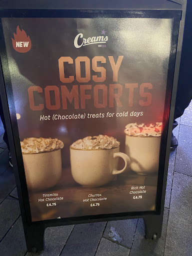 I came to this creams and I have to admit that the desserts were nice and appealing to seat down to eat. I've paid 5 things which would came one by one, the employer who was serving to the tables reached our table with the last thing, a cappuccino but I ordered a Latte the same employer said that she didn't even know the names of the (hot) drinks, the responsible for the drinks would only say "take". After too many times insisting for her to bring me a Latte, she brought it to me again the exact same drink. 18 minutes after, I've asked a refund of the Latte because I'm not coming to eat outside to teach people how to make hot drinks. The drinks's responsible started an argument with me trying to say that she was alone and full of work and I replyed that she should serve me first because the people who came after me had already been served. She was still trying to argument with me knowing I was FULL of reason after this they're still talking about us (me and my family) and while we were writing this review they came to invite us to go out (trying to take the plates from the table). For sure at least 2 persons in this restaurant should have a customer service class. I'm not that much irritating customer, just...