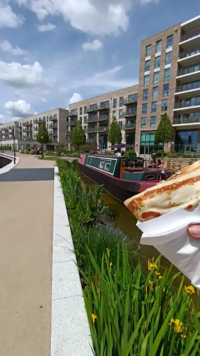 I had a sweet crepe with banana, Nutella, and salted caramel paired with a blueberry matcha drink. Both were delightful! The best part? There are couple of sitting afre by the deck however plenty of seating by the canal and a warm welcome from the owner, Pavo, who runs his business from a narrowboat. His community-focused approach, reasonable prices, and local hires set Crepes+Coffee apart.