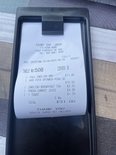 I recently had the pleasure of dining at Cup of Joy, a charming café and restaurant located at 117 High Road in East Finchley. From the moment I stepped in, the warm and welcoming atmosphere made me feel right at home. The staff were exceptionally friendly and attentive, ensuring that my dining experience was nothing short of delightful.