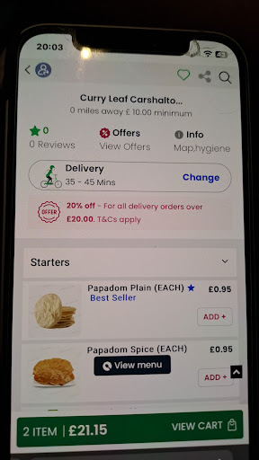 After persuading my partner to go directly to the restaurant, we checked the website for the menu and saw an offer, 20% off delivery over orders for £20. We rang to order and after saying what we would like ( we rang to ensure a certain ingredient was not on the food ), we asked if the price included the 20% discount. To be told there is no discount unless cash and collect, not delivery. After being passed to a manager, he eventually said they would include a free drink and poppadoms.