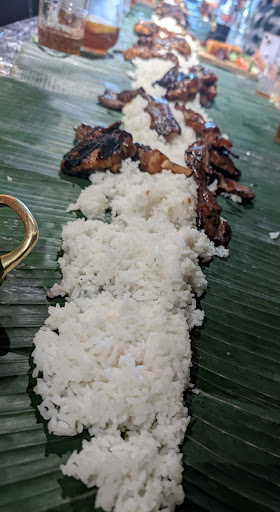 We ordered the boodle fight, a feast beautifully arranged with rice, chicken inasal, BBQ chicken wings, king prawns, aubergine, mango ensalada, mussels, corn, pork BBQ liempo, and pork BBQ skewers. Every dish was flavourful and perfectly cooked. It was a fantastic variety for everyone at the table. We also had their special palabok and ube cake, which were just as delicious. For a refreshing touch, we had watermelon and pineapple slices on the sides.