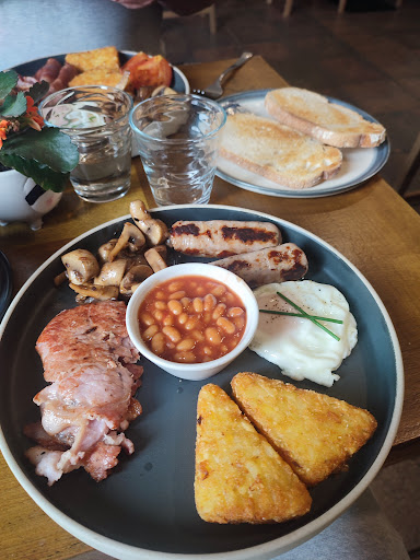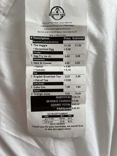 Ridiculous 2 egg fry up £5 Panini £0.95 rediculous price Inside panini tomato £0.70 rediculous price Ham &cheese inside panini £4.00 ridiculous price English breakfast tea with veggie breakfast every where is free …. £1.80 cold pot inside Cold tea … Orange juice is not very good is well and Of course ridiculius price £5 *2 = £10 It was free if you buy breakfast old owners Fresh orange juice