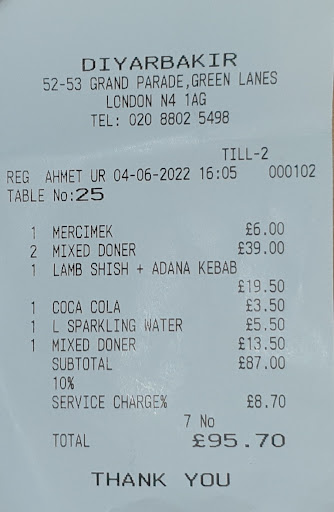 Read moreWe visited this place on 26th Aug 2024 after recommendation by a professional chef but unfortunately only realised later that this was the wrong one despite them having the EXACT same name on the outside but found out they trade as Diyarbakir Kitchen online and Google maps. Whilst the mezzes and meat were fresh, the food lacked flavour. For the high cost of what they charge for the basic main course dishes (£22-31) in an area that's culturally focusing on traditional Turkish food, I think lack of flavour shouldn't be a concern! I would've have left it at that but the reason I felt I needed to leave this review was due to the mediaocre customer service we got and being charged service charge! For a restaurant that has almost a dozen table staff, we had to ask 3 times each time for every bit of service or asking us how the food is!! Not too mention the miserable lack luster dimeanor they talk to you. I wouldn't say they were rude just unfriendly and unhelpful. Whilst we're probably quite patient customers compared to most, paying such high prices for the food and the lack of service, left a very bad taste in our mouths!! My advice, save your money and try the other places on...