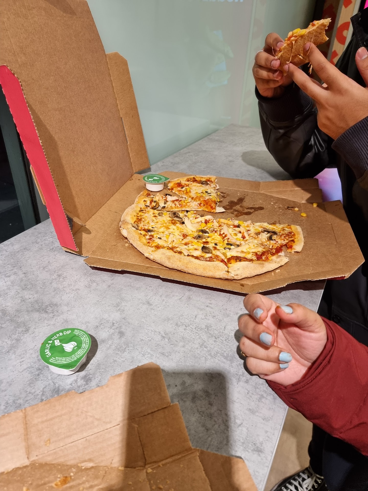 Ā Ā Ā Read moreDisappointing to get pizza at Dominoās. Orders are only online and you canāt just walk up to the counter. The staff are unhelpful as well. Pizza wasnāt that good either with most toppings off to the side and because it was hastily cut, the slices were not even close to being of equal size. We had the chicken strips as well and I donāt think they were made of chicken. Dominoās was my go to local pizza place back home, but this one is terrible and I would not recommend. Your best bet is to go to Tesco around the corner and buy a frozen pizza for a fraction of the price. It will taste better and the self serve cashier is friendlier than the staff at...