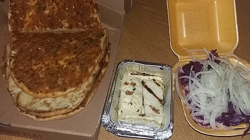 I had ordered Lahmacun. Now anyone who knows what this is knows ANYWHERE you buy it it comes with a side salad because, well, you eat it with a side salad. I'm looking at a take-away Pizza box, a little foil box with my Halloumi..."hey, um, is there no salad with the Lahmacun?"... nope - this is the only Turkish in London (that I know of) that sells Lahmacun without salad - huh? :o/ (for the record, this is like buying a Kebab and you have to pay extra for the salad in it).