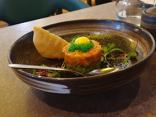 About 10 minutes later, my partner's starter arrived, and it took another 10 to 15 minutes for mine to be served, with no apology or explanation for the delay. Things only got worse when my partner's main course was served in parts—her salmon arrived first, and the rice that was supposed to accompany it was delivered 5 to 10 minutes later.